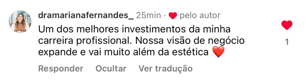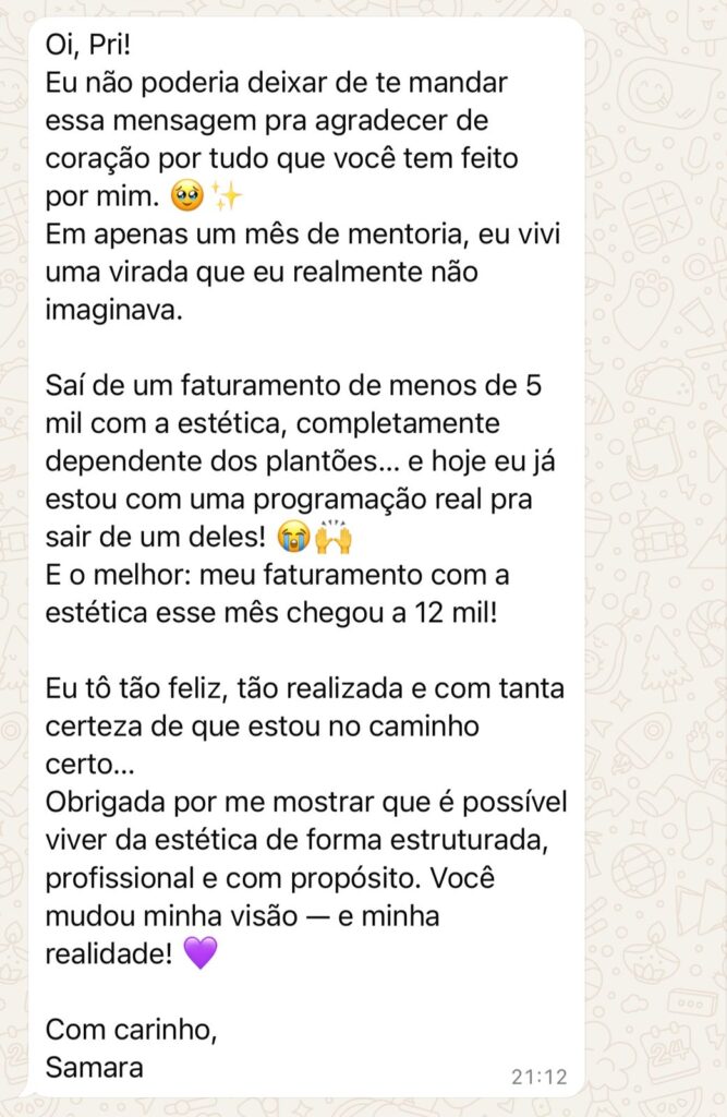 Com muita coragem, estratégia e a clareza que um método traz, eu consegui me desligar de dois empregos públicos. Transformei essa dedicação em uma carreira sólida e previsível na estética, conquistando finalmente a liberdade financeira e a segurança que tanto almejava.