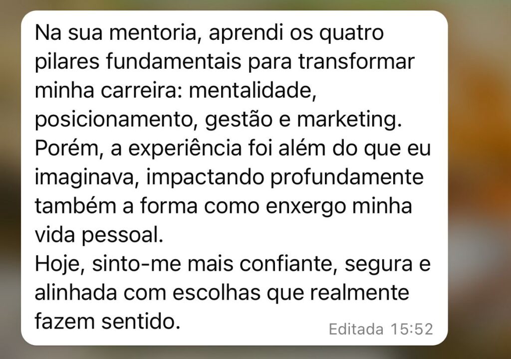Aqui, você vai desconstruir crenças limitantes, eliminar a insegurança e se preparar para ter a clareza e a confiança necessárias para cobrar pelo seu valor e construir uma carreira sólida.